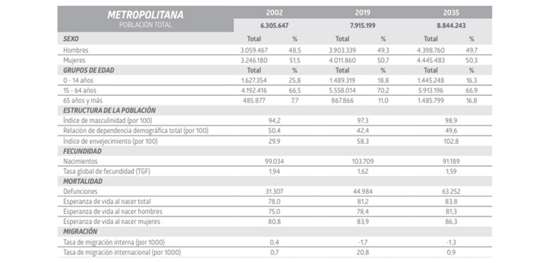La dinámica poblacional de la Región Metropolitana de Chile entre 2002 y 2035 evidencia importantes transformaciones demográficas que reflejan cambios en la estructura etaria, de patrones de fecundidad, de mortalidad y migración, así como en la distribución urbana y rural de la población. Estos cambios plantean desafíos significativos para la planificación de políticas públicas, particularmente en áreas como la salud, la educación, el empleo y la infraestructura urbana. Este análisis, basado en las estimaciones y proyecciones elaboradas por el Instituto Nacional de Estadísticas (INE), permite comprender las tendencias clave de crecimiento y envejecimiento poblacional, así como los cambios en la composición de grupos etarios específicos, como adolescentes y adultos jóvenes, y su impacto en la sociedad chilena. A continuación, se presenta una síntesis de los principales hallazgos relacionados con esta evolución y sus proyecciones.Según las estimaciones, entre 2002 y 2035, la población de la Región Metropolitana de Chile muestra un incremento significativo, pasaría de 6,3 millones a 8,8 millones de habitantes. Este crecimiento de 40,3% refleja, además, una tendencia continua de urbanización, con la población urbana representando más del 96% en todo el período proyectado. Además, el índice de envejecimiento experimentará un alza considerable, pasando de 29,9 a 102,8 personas mayores de 65 años por cada 100 menores de 15 años, destacando un envejecimiento poblacional marcado (INE, 2019).