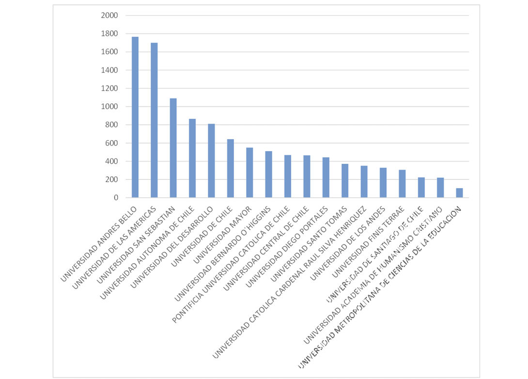Entre las instituciones con mayor cantidad de vacantes destacan la Universidad Andrés Bello y la Universidad de Las Américas, liderando con cifras cercanas a las 1800 vacantes. Le siguen otras universidades como la Universidad San Sebastián y la Universidad Autónoma de Chile, con sobre 1000 y 800 respectivamente.