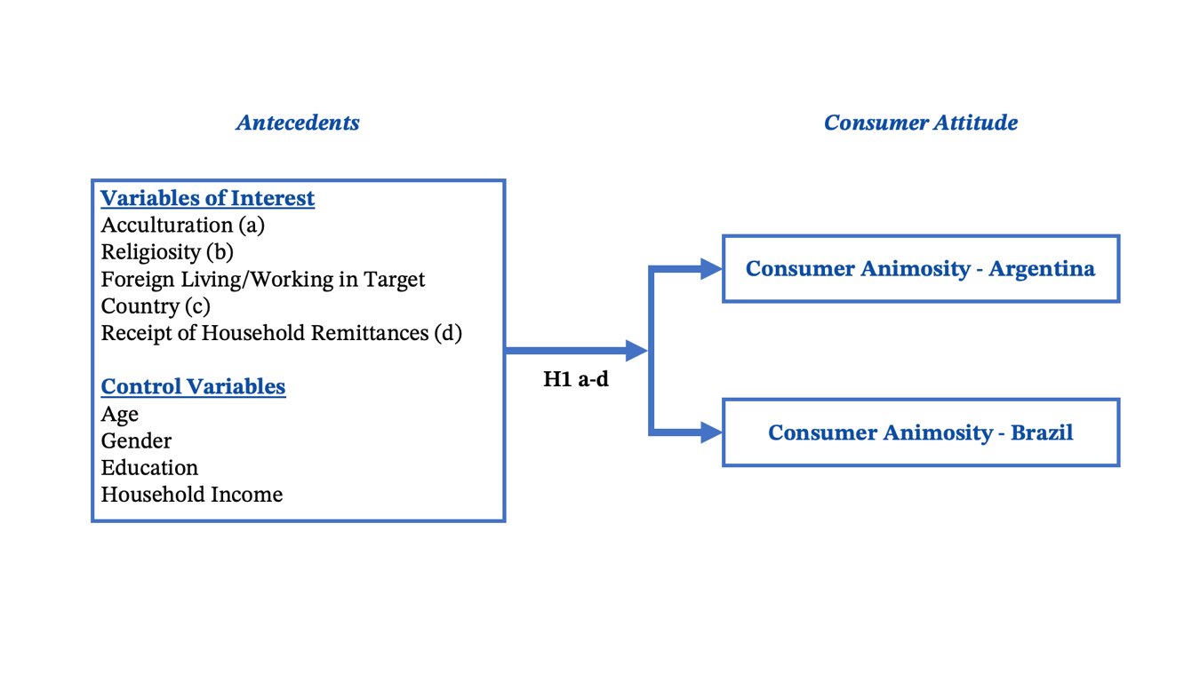 Our research seeks in part to replicate and extend the consumer animosity construct into two new country pairs in South America, offer novel antecedents for consumer animosity, and model these elements into consumers’ willingness to buy specific foreign-origin products. We are the first to focus on Paraguayan consumer animosity vis-à-vis Argentina and Brazil, replicating the applicability of consumer animosity in these bilateral environments. Novel antecedents of acculturation, religiosity, lived and worked time in the target foreign country, and the receipt of household remittances are tested as an extension of the literature on consumer animosity.