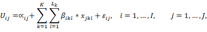 donde i. es el número del encuestado; j es el número de perfiles; . es el número de atributos; Lk es el número de niveles del atributo k; bikl es la utilidad del individuo i-ésimo con respecto al nivel . del atributo .; xjkl es la variable (0,1), que es igual a 1 si el perfil j tiene un atributo k en el nivel l, y 0 en otros casos; αij es la constante de la regresión y eij es el error de estimación.