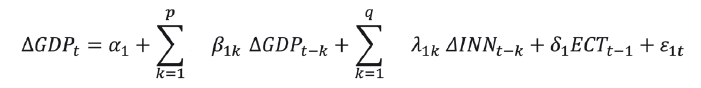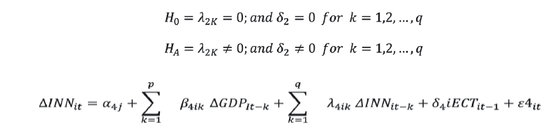 The methodology chosen in this study is based on Granger (1969). Other causality testing methods reported in the literature include the test proposed by Sims (1972) and the procedure suggested by Pierce and Haugh (1977). In this study we empirically test the relationship between two variables which are: innovation and per capita economic growth. To be precise the causality between innovation and per capita economic growth can be addressed in four different ways: supply-leading hypothesis of innovation-growth nexus, demand-following hypothesis of innovation-growth nexus, feedback hypothesis of innovation-growth nexus, and neutrality hypothesis of innovation-growth nexus.