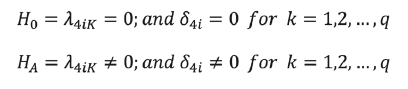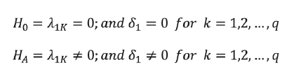 Where ECT is the error correction term, derived from the long-run cointegration equation; p and q are the lag lengths for the estimation; Δ is the first difference operator; and ε1t and ε2t are the independent and normally distributed random error with a zero mean and a finite heterogeneous variance.